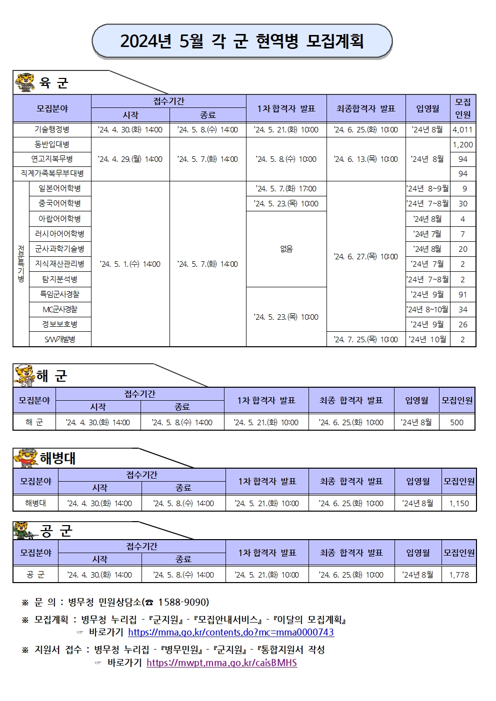 2024년 5월 지원하여 2024년 8월 입영예정인 각 군 현역병 모집일정을 송부하니 학생들의 병역의무 이행에 참고 바랍니다.