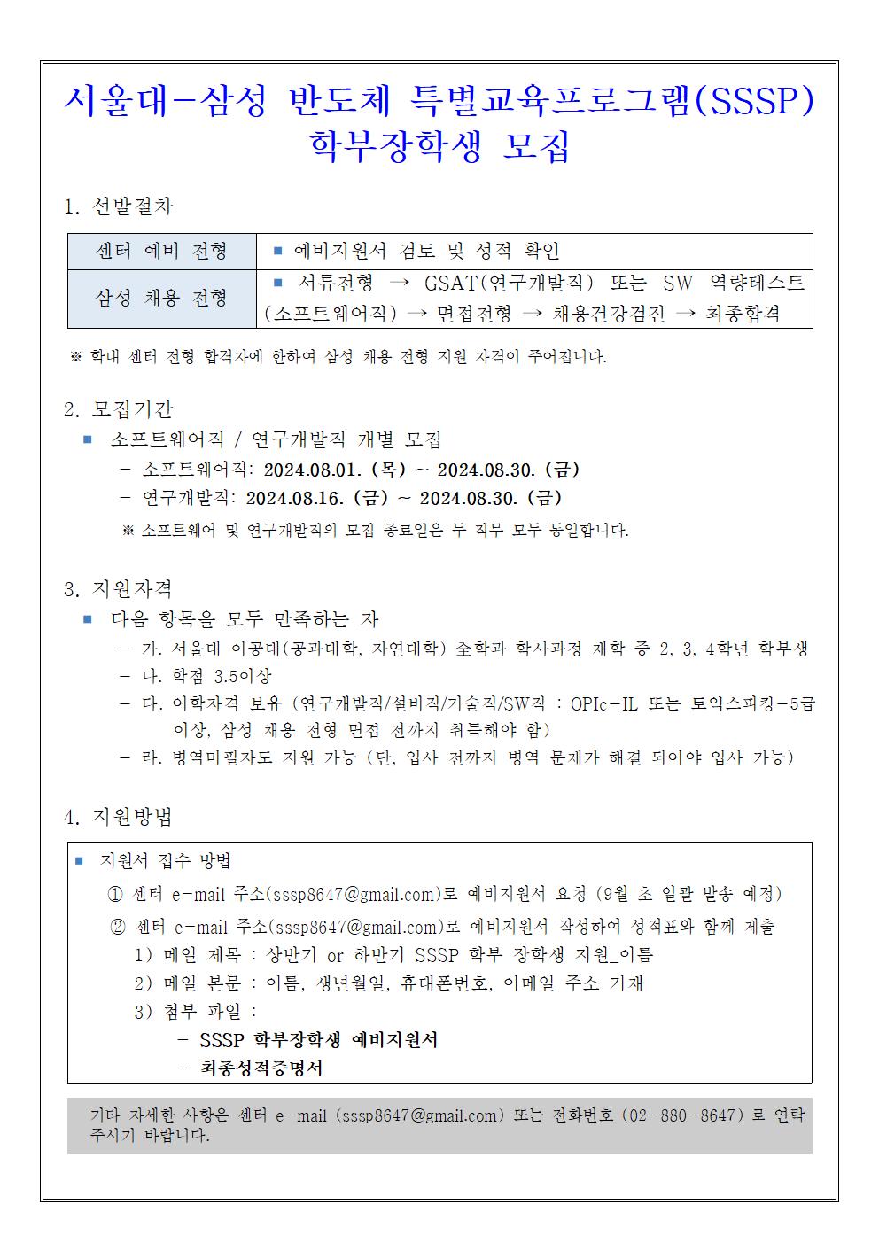 기타 자세한 사항은 센터 e-mail (sssp8647@gmail.com) 또는 전화번호 (02-880-8647) 로 연락주시기 바랍니다