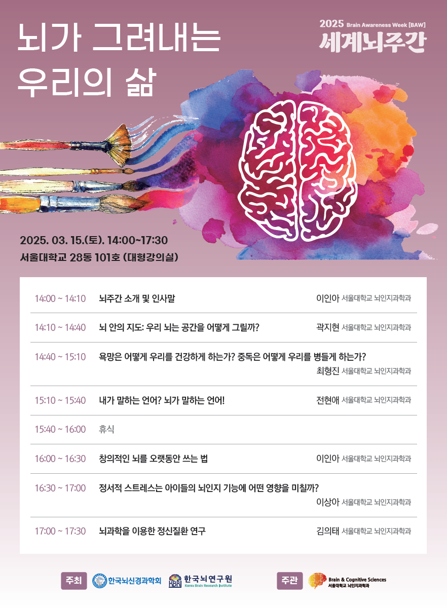 서울대학교에서도 세계적 캠페인에 동참하기 위해 해마다 대중강연을 포함한 뇌주간 행사를 뇌인지과학과 주도로 개최해 왔습니다. 올해 행사에서는 “뇌가 그려내는 우리의 삶”이라는 주제로 일반인이 궁금해할만한 뇌과학적 지식을 뇌인지과학과 교수님들께서 쉽게 풀어서 대중강연을 통해 전달할 예정입니다.