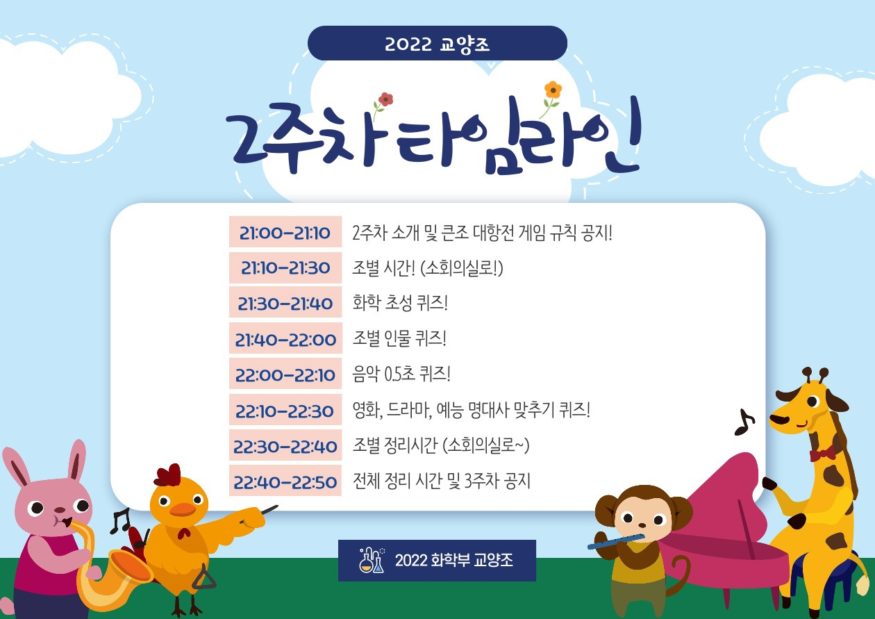 사진 2. 교양조 2주차 타임라인. 화학 초성 퀴즈, 조별 인물 퀴즈, 음악 0.5초 퀴즈, 영화, 드라마, 예능 명대사 맞추기 퀴즈 등의 활동을 어느 시간에 했는지 확인할 수 있다.