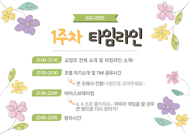 사진 1. 교양조 1주차 타임라인. 자기소개와 TMI 공유, 아이스브레이킹 등의 활동을 어느 시간에 했는지 확인할 수 있다.