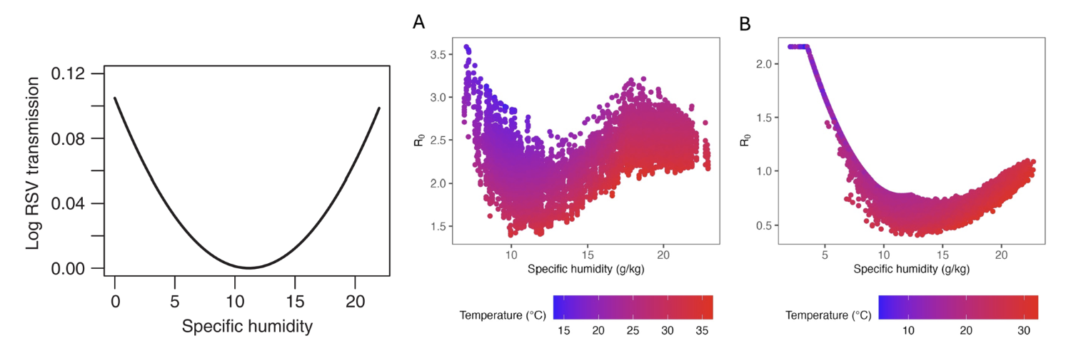 (우측)인플루엔자의 기초감염재생산수와 비습, 온도와의 관계를 보여주는 그래프. A는 방글라데시 다카에서, B는 홍콩에서 수집된 데이터를 통해 얻어진 그래프이다. (출처 = Stamper et al., 2025)