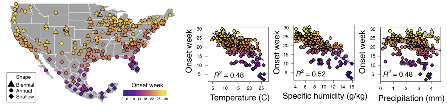 그림 2. (좌측)미국과 멕시코에서 RSV의 유행 시작 시기의 분포. 색깔이 노란색에 가까울수록 유행 시작 시기가 늦다는 것을 의미한다. 남쪽에서 북쪽으로 올라갈수록 유행 시작 시기가 점점 늦어지는 것을 볼 수 있다. 이러한 공간적 분포의 기저에는 기후의 영향이 깔려있다. (우측)RSV의 유행 시작 시기와 온도, 비습, 강수량과의 상관관계를 보여주는 그래프. (출처 = Baker et al., 2019)