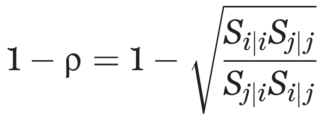 여기서 생태적 지위 겹침을 1에서 뺀 값을 새로운 변수로 설정할 수 있습니다. 이 변수 역시 0과 1 사이의 값을 가지게 되고, 이 변수가 가지는 값에 대응되는 의미는 생태적 지위 겹침과 정확히 반대입니다. 이 변수는 값이 0에 가까울수록 지위가 비슷해서 종간경쟁이 심하다는 것을 의미하고, 1에 가까울수록 지위가 달라 종간 겹침이 없고 공존하기가 쉽다는 것을 의미합니다. 따라서 1에서 생태적 지위 겹침을 빼준 값을 ‘Niche difference(생태적 지위 차이)’라고 부르게 됩니다. PIT에서는 감염병들 사이의 지위 차이를 보기 때문에 특별히 ‘Immunological niche difference(면역학적 지위 차이)’라는 단어를 사용합니다. 면역학적 지위 차이는 아래의 식과 같이 구할 수 있습니다.