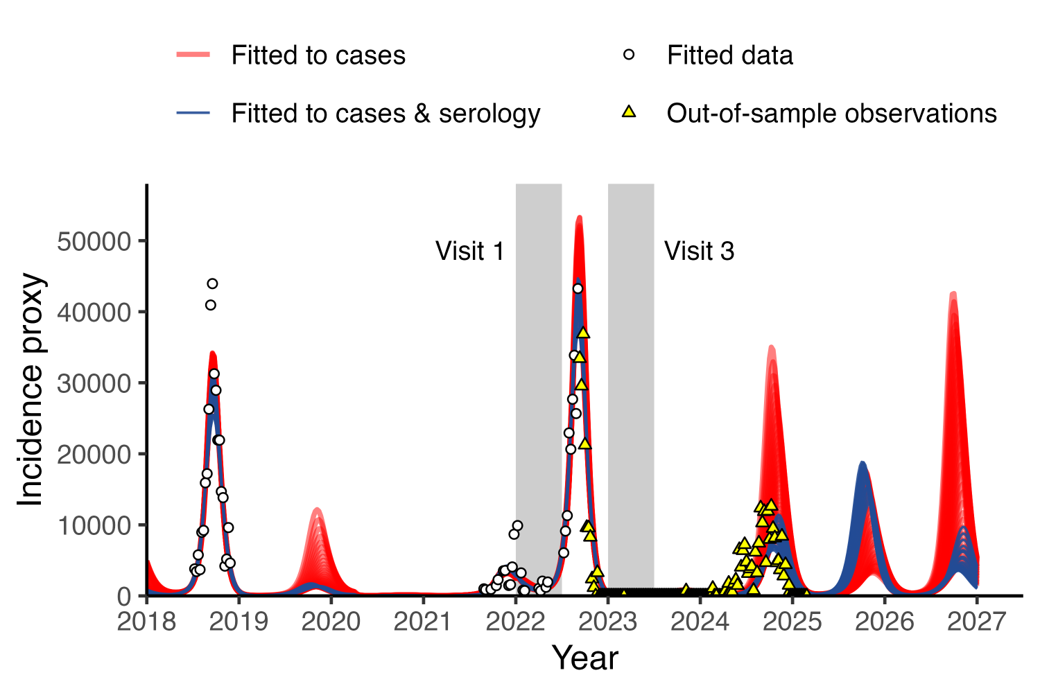 이 감염병의 유행 주기는 2년입니다. 2014년, 2016년, 2018년에 유행했기 때문에 그걸 토대로 2020년 가을에도 유행할 것이라는 예측을 했었는데 그 예측을 했을 때가 2020년 초반이었습니다. 그런데 코로나로 인해 사회적 거리 두기를 시행하면서 2020년에 유행하지 않을 것이라고 다시 예측을 수정했고 실제로 2020년에 유행하지 않았어요(Park et al., 2021). 그다음 유행은 2022년이었습니다. 추후에 그러면 어떤 패턴으로 또 유행할지 모델링을 해서 예측 및 분석하는 논문을 제가 썼었는데(Park et al., 2023) 그때 확진자 수 데이터만 가지고 예측을 해보니까 불확실성이 컸었습니다. 그래서 혈청 데이터를 같이 합쳐서 예측을 한거죠.