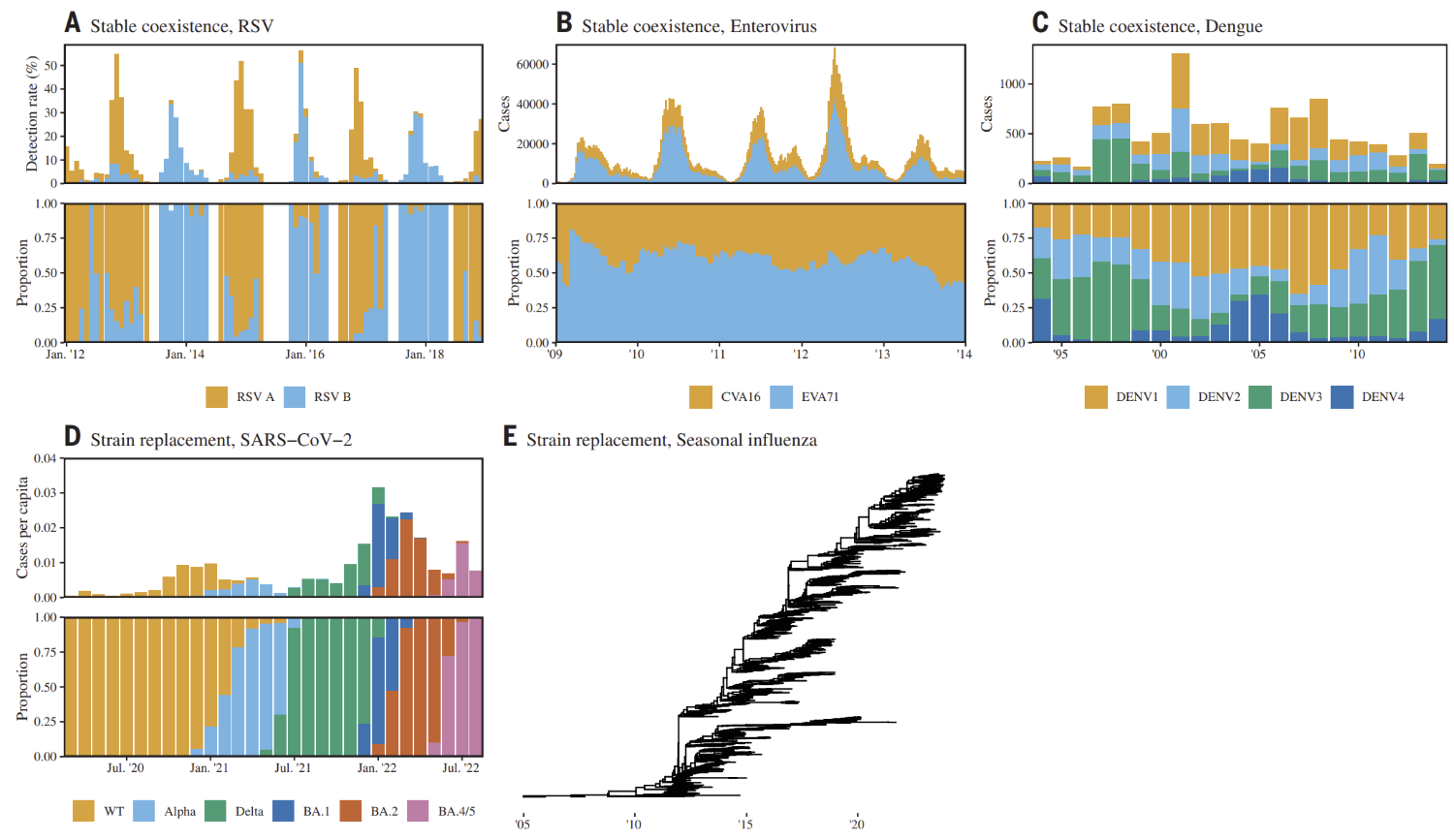 그림 3. 감염병마다 공존 패턴이 어떻게 되는지를 보여주는 그래프. A(RSV), B(장내바이러스), C(뎅기열)은 변종들끼리 공존하지만, D(코로나바이러스), E(인플루엔자)는 새로운 변종이 나타날 때마다 이전 변종들이 멸종하는 모습을 보여준다. (출처 = Park et al., 2024)