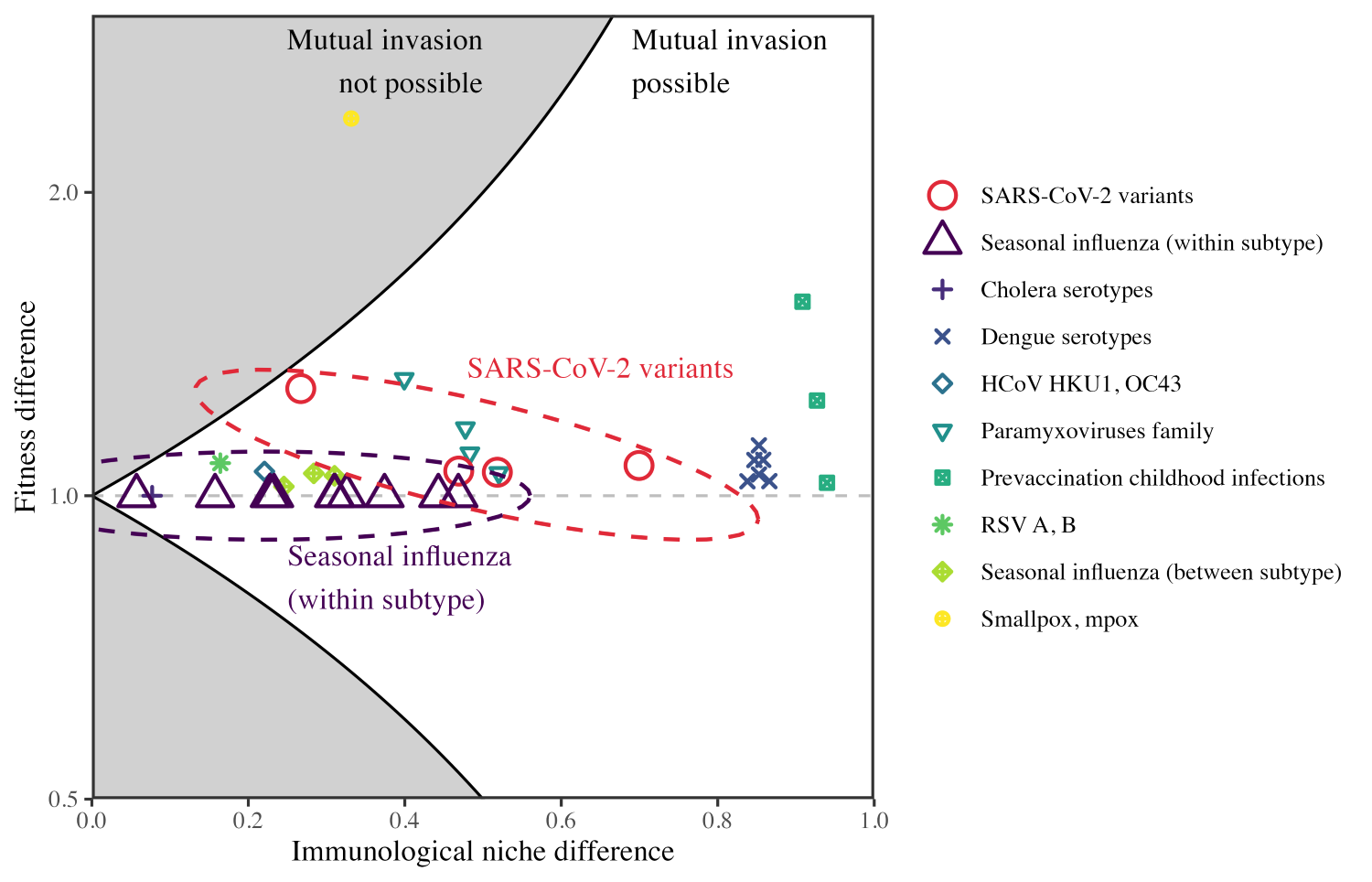 사실 그래서 이 논문에서 보인 것은 균주 교체를 보이는 바이러스조차도 상호 침입은 가능하다는 것과, 상호 침입성 자체가 공존에 대한 limiting factor(한계 요인)이 아니고 침입 이후에 일어나는 일들이 한계 요인이라는 것이죠.