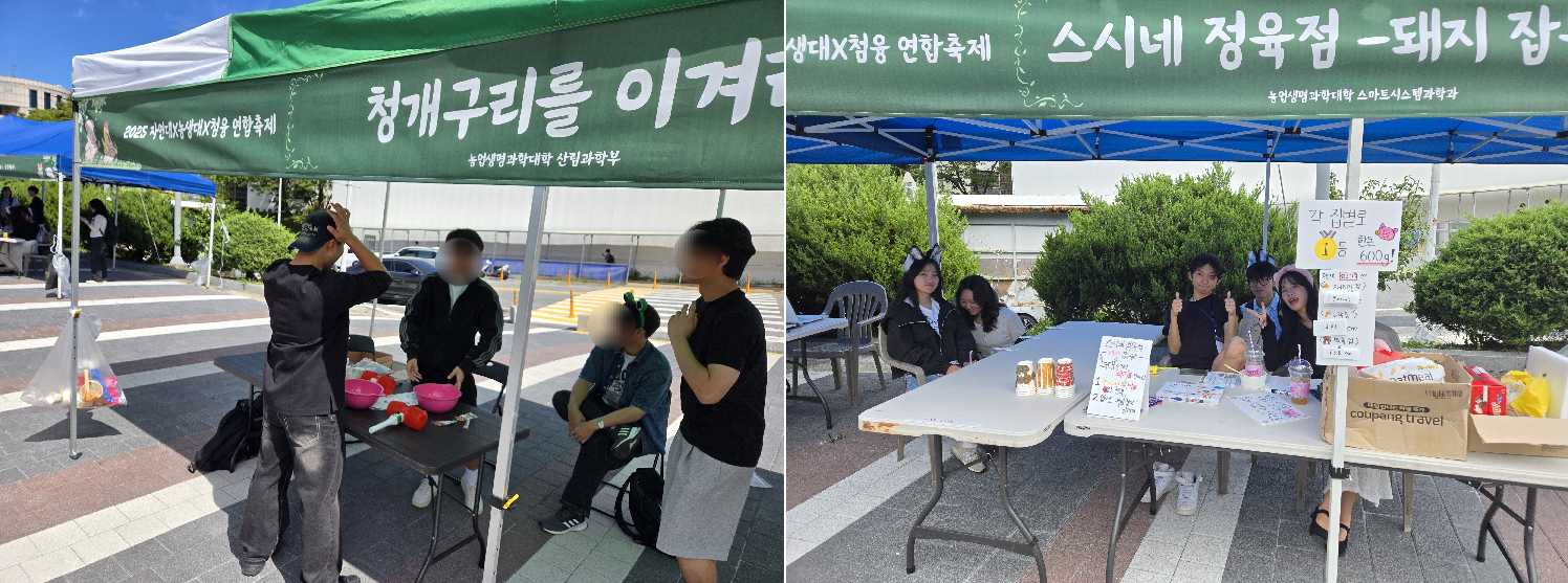 (좌) 산림과학부 부스 ‘청개구리를 이겨라’, (우) 스마트시스템과학과 부스 ‘스시네 정육점 - 돼지 잡는 날 -’ (사진=조민정 기자)