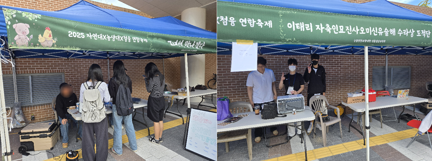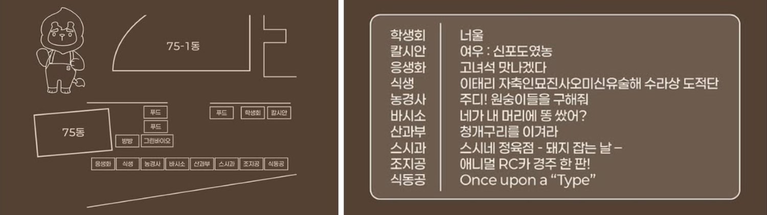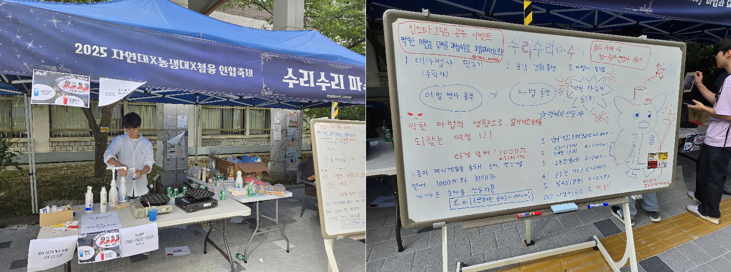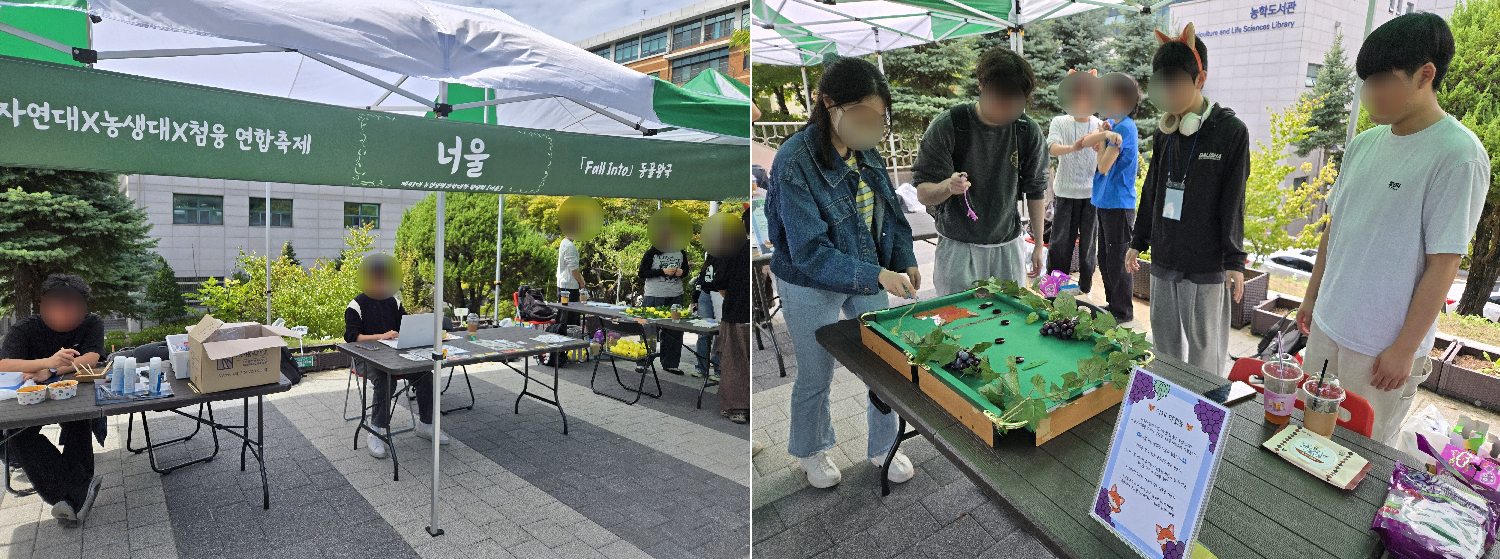 (좌) 응용생명화학부 부스 ‘고녀석 맛나겠다’, (우) 식물생산과학부 부스 ‘이태리 자축인묘진사오미신유술해 수라상 도적단’ (사진=조민정 기자)