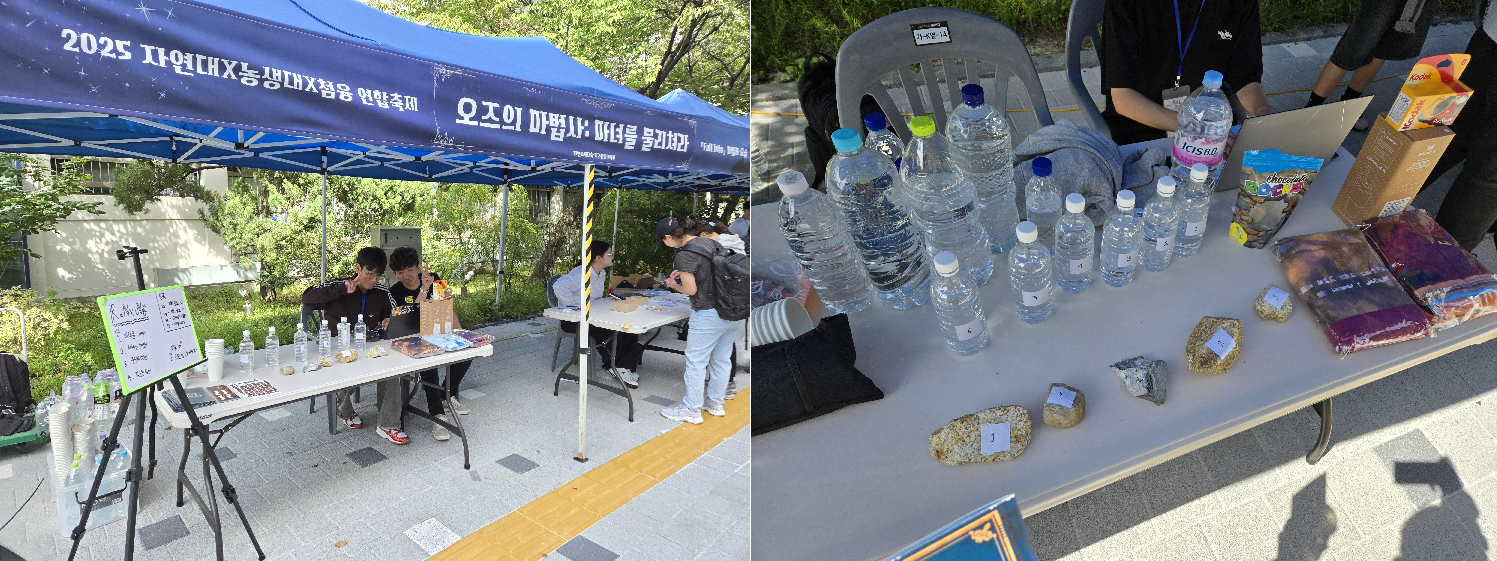 지구환경과학부 부스 ‘오즈의 마법사: 마녀를 물리쳐라’에서는 돌 무게 맞추기, 물 종류 맞추기, 그리고 키링 만들기를 체험해 볼 수 있었다. 돌 무게 맞추기는 다양한 종류의 돌 중 하나를 선택하여 최대한 비슷한 무게를 맞추는 게임으로, 오차가 작은 상위 4인에게는 순서대대로 지구환경과학부 담요, 텀블러, 디지털 카메라가 증정되었다. 물 종류 맞추기는 생수의 브랜드를 맞추는 게임으로, 이전 게임에서 오차가 작을수록 브랜드의 범위가 줄어들었다. 이러한 체험을 통해 간식을 얻을 수 있었다.