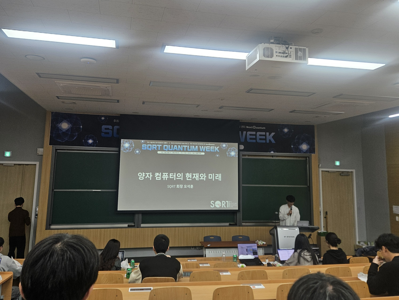 행사는 동아리의 회장과 부회장의 강연으로 시작되었다. 강연은 “양자컴퓨터의 현재와 미래, 여러 플랫폼의 소개”라는 주제로 , 양자컴퓨팅에 문외한인 학생들에게 친절하게 양자컴퓨터의 전반적인 내용들을 설명함을 통해, 행사의 대부분을 차지하는 교수님들의 구체적인 연구분야에 대한 강연들을 따라갈 수 있게 구성되어 있었다. 강연의 전반부는 양자컴퓨터를 양자컴퓨터로 만드는 양자역학의 핵심적인 부분들에 대한 소개로 시작하였다. 양자컴퓨터의 응용분야를 소개하며 해당분야의 발전의 필요성을 각인시며, 특히 모든 문제를 해결하는데 양자컴퓨터가 효율적이지는 않지만, 고전적 컴퓨터로 해결가능한 문제들은 거의 풀렸기에, 아직 풀리지 않는 문제들을 풀 수 있다는 것에 양자컴퓨터 연구의 의의가 있음을 강조하였다. 양자컴퓨터는 양자역학 그 자체로 거동되기에 양자역학관련 문제들을, 물리학 그 자체로 문제를 해결한다는 이점을 가진다는 것 또한 강조하였다.