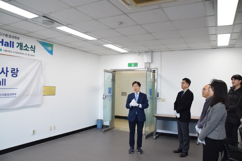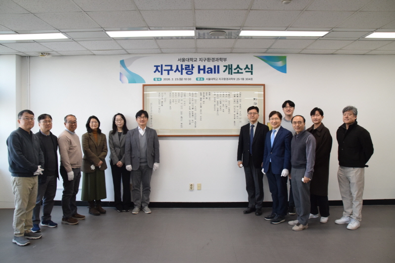 지구환경과학부 이상만 명예교수님께서 지구시스템전공에 기증해 주신 지구사랑 시 및 서예작품(2008년 유엔이 정한 지구의 해 헌정시)을 지구환경과학부 메인홀인 25-1동 304호에 상설 전시하게 되었습니다. 작품 전시를 위해 25-1동 304호를 "지구사랑 Hall"로 개명하여 현판을 붙이고 지구사랑홀 개소 및 이상만 교수님 작품 상설전시를 기념하는 개소식을 2026년 2월 23일에 자연대 학장님과 지구환경과학부 여러 교수님들께서 참석한 가운데 진행하였습니다.